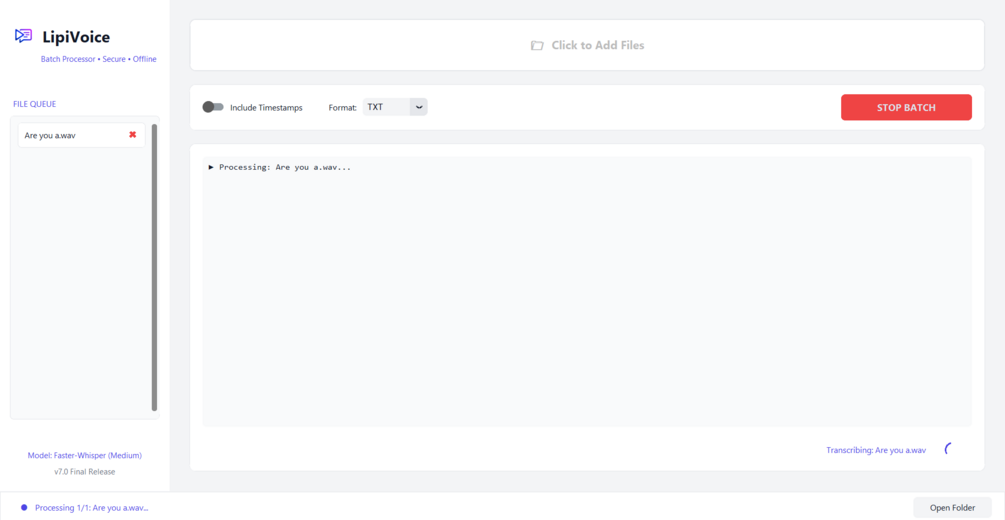 ✅ Unlimited Batch Processing: Drag & drop hundreds of files and transcribe them all at once.